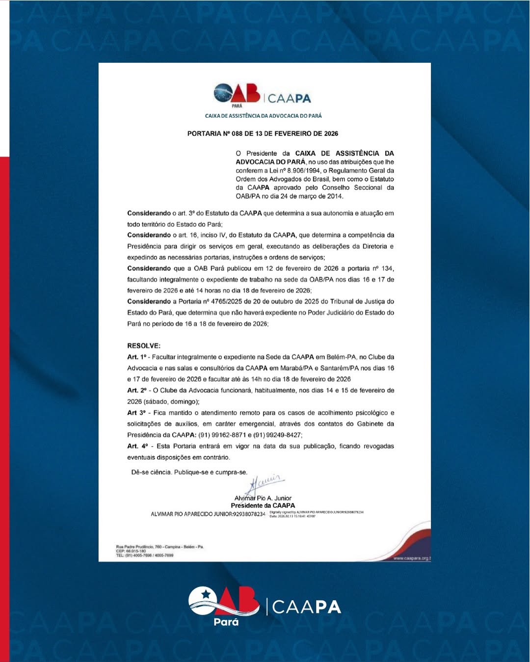 Antes de cair na folia ou aproveitar o merecido descanso, confira os horários e eventuais ajustes no atendimento da Sede, do Clube da Advocacia e das salas e consultórios em Marabá e Santarém.